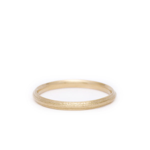 A slim gold band with a subtle textured finish and an elegant contoured detail.